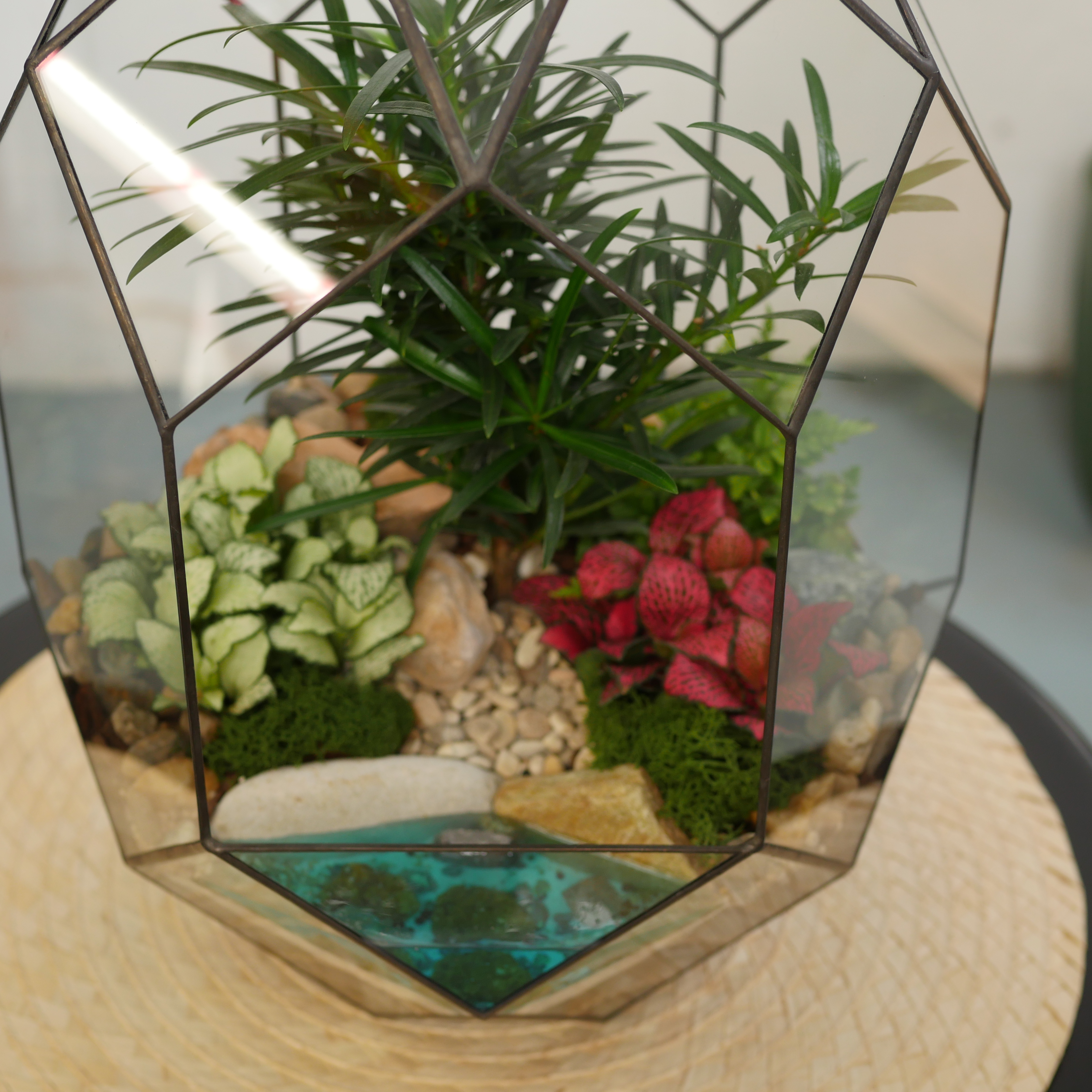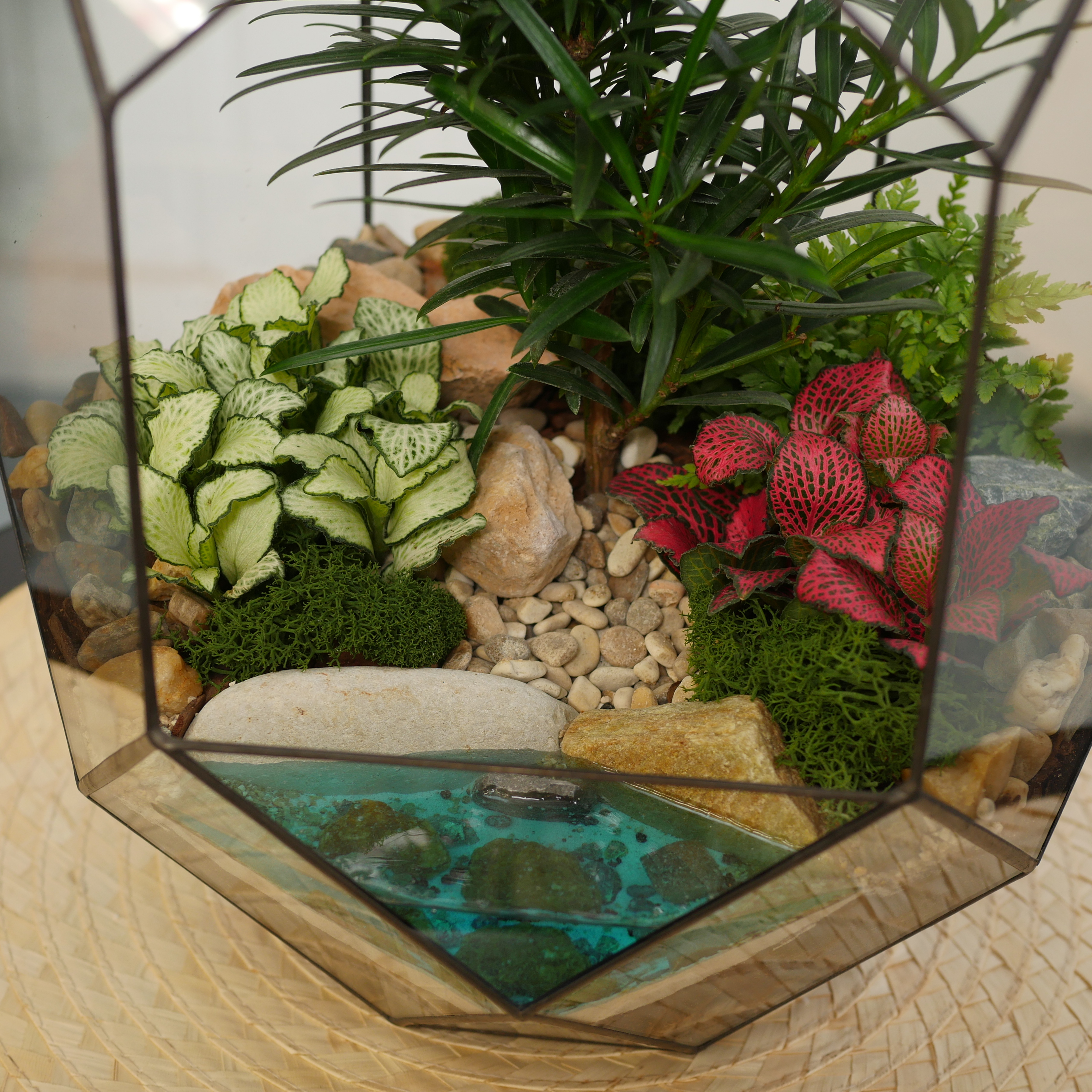 Флорариум ручной работы с неприхотливым бонсай. Карликовое дерево достаточно медленно растет, поэтому будет долго радовать вас в этой стеклянной вазе. Необходимо изредка подстригать бонсай, формируя крону дерева. Полив 2 раза в неделю. Украшен камнями и стабилизированным мхом (мох не нуждается в поливе, сохраняет свой цвет в течение 10 лет). Имитация озера выполнена из эпоксидной смолы.