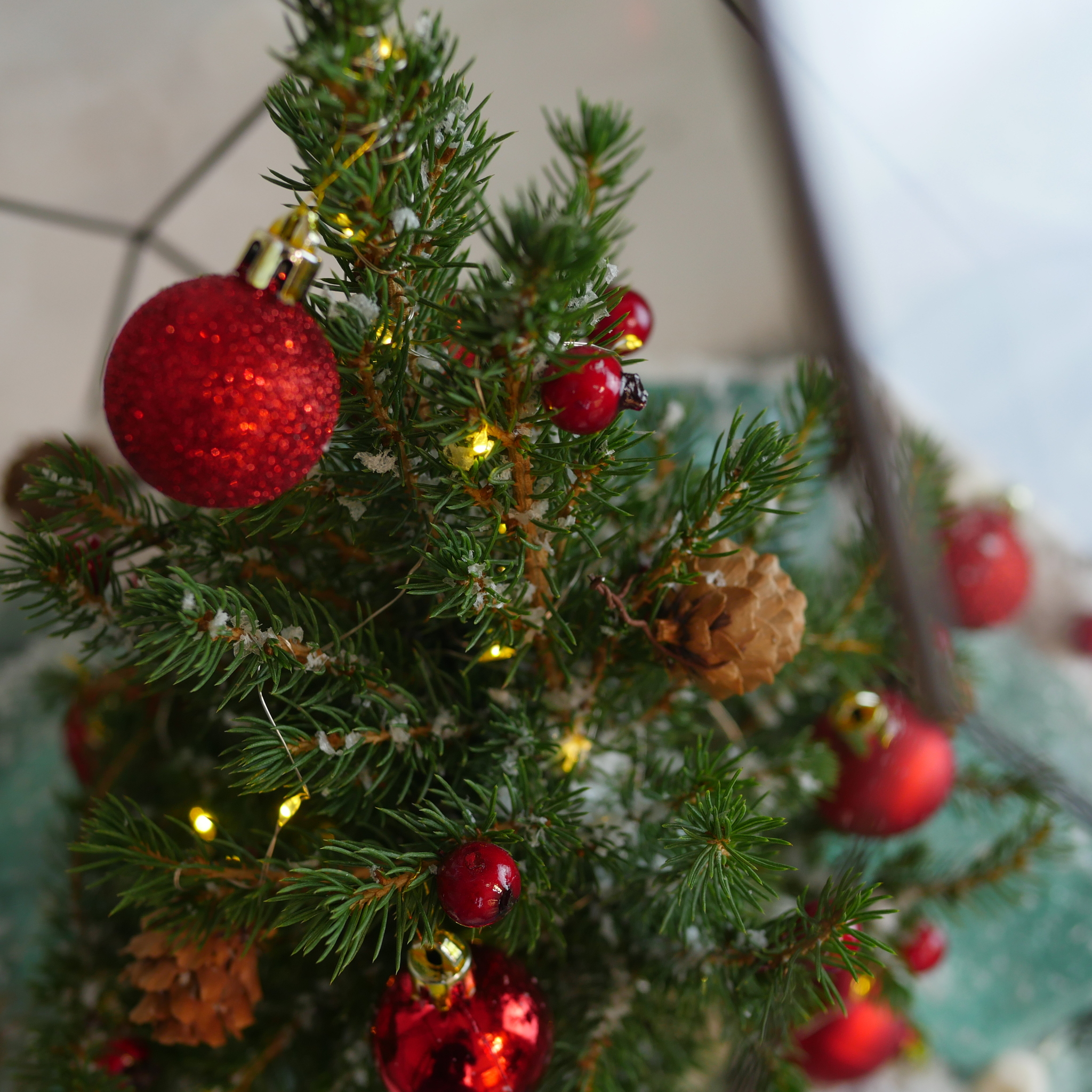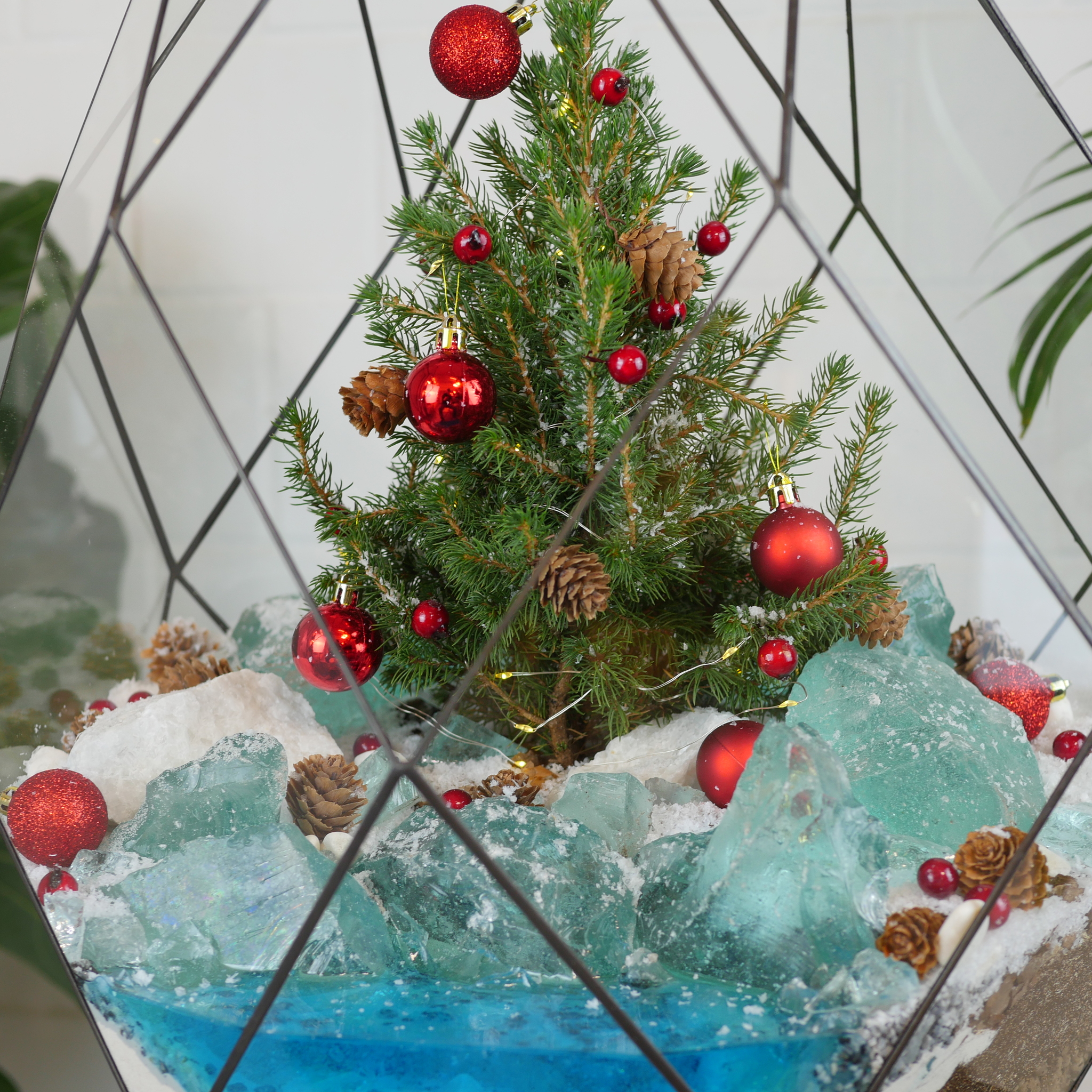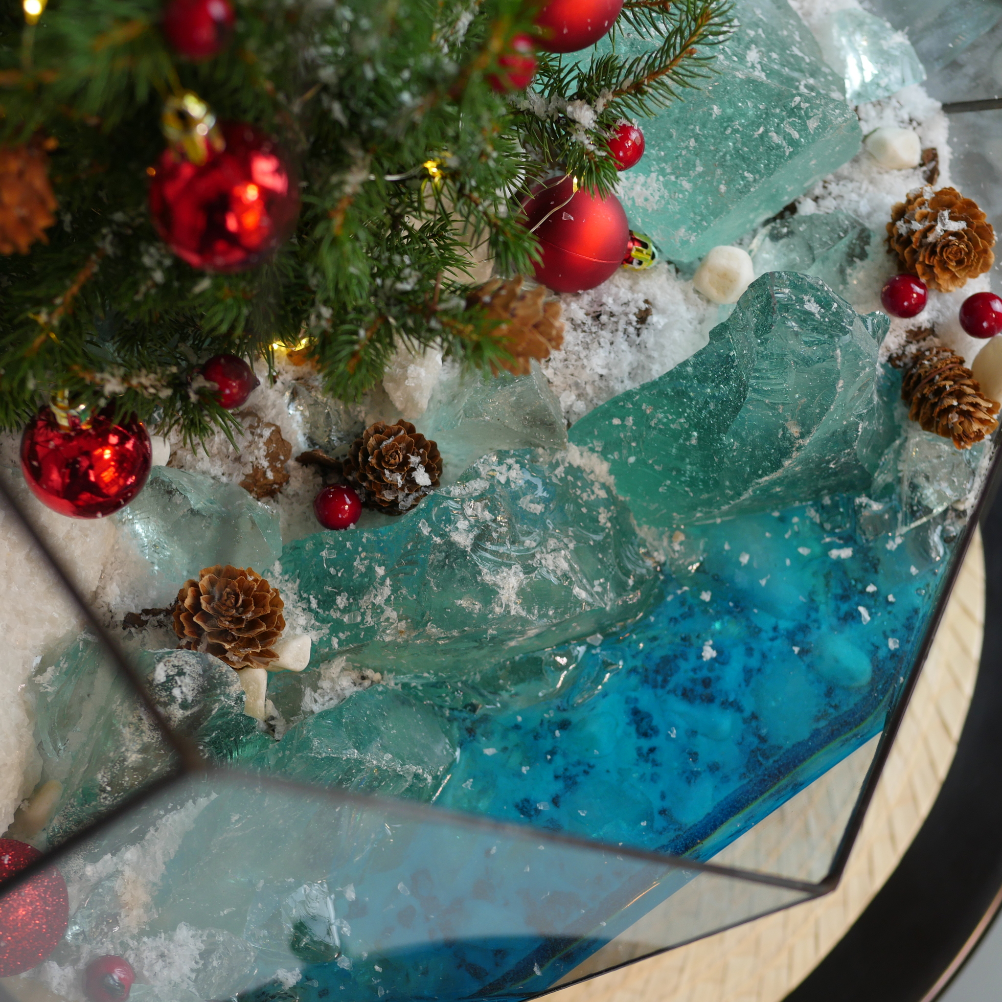 Украшен камнями, стеклом, декоративным снегом, елочными игрушками и гирляндой на батарейках. Имитация озера выполнена из эпоксидной смолы.